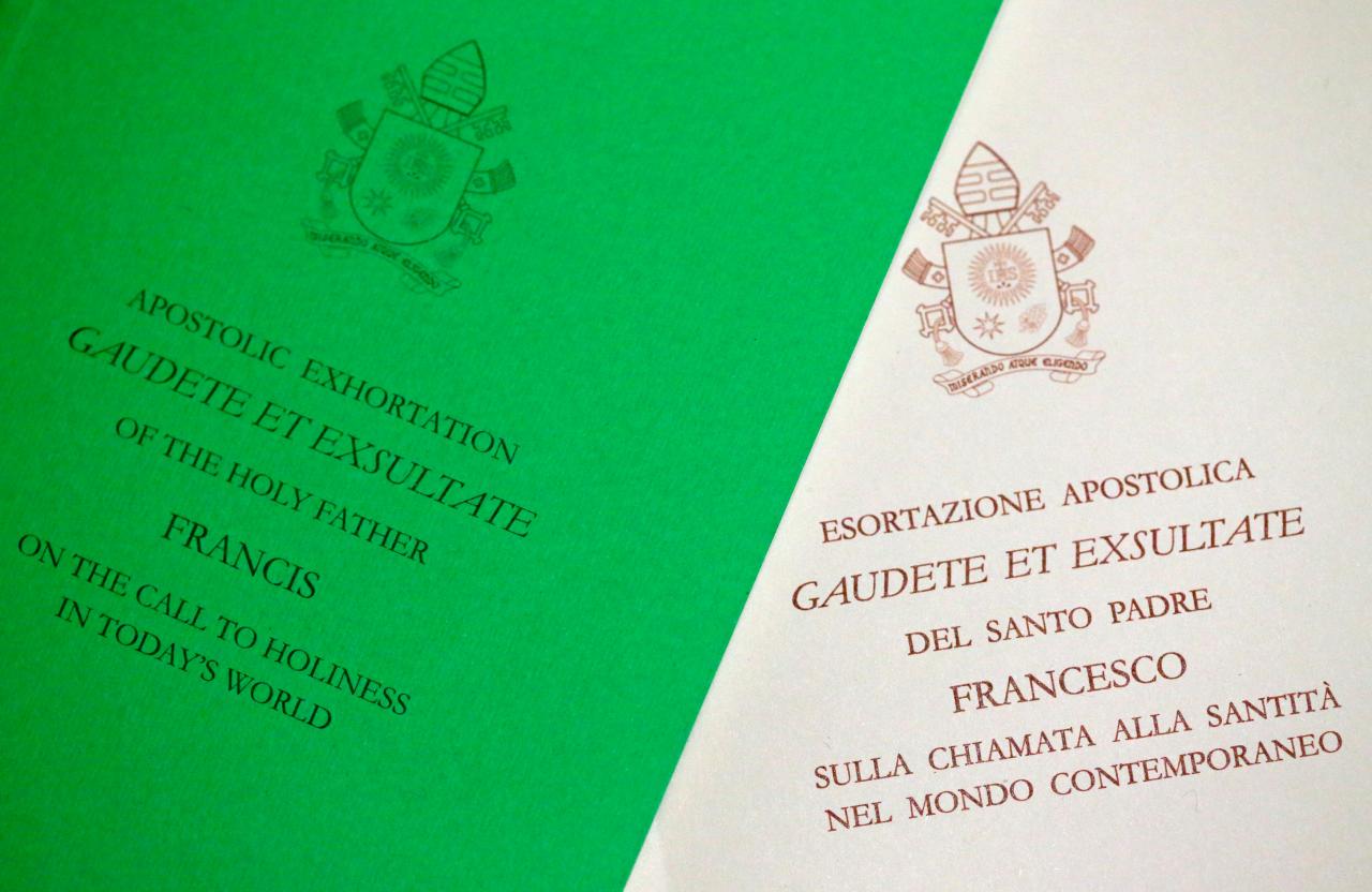 Pope Francis document, known as an apostolic exhortation, entitled Gaudete et exsultate (Rejoice and be glad), is seen in this picture illustration taken at the Vatican